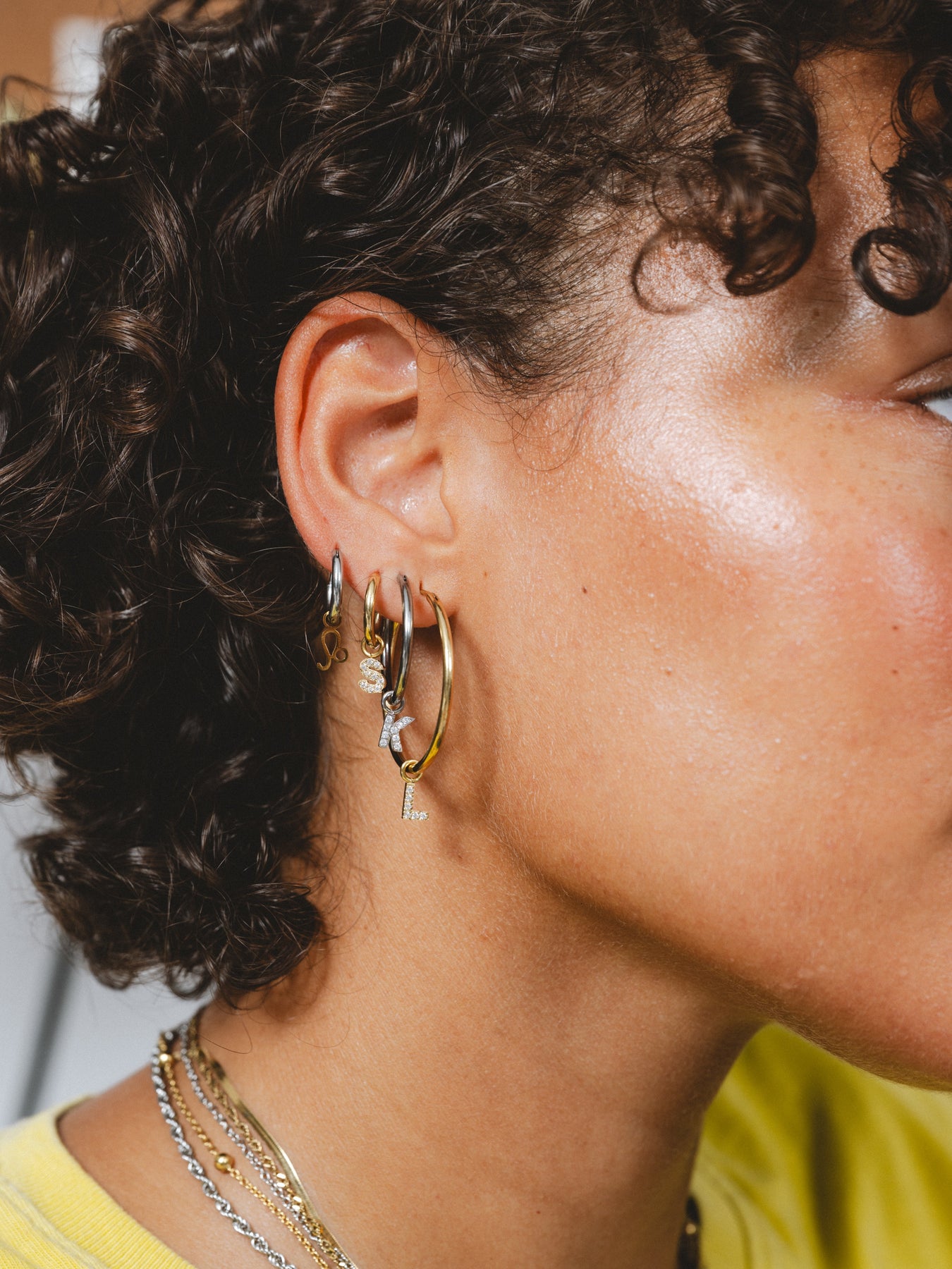 The Icy Initial Charm is designed to catch the light with every move. Customizable and interchangeable, it pairs perfectly with our My Huggies Hoop Earrings and My Huggies Sparkle Hoop Earrings, allowing you to create a look that's uniquely yours.