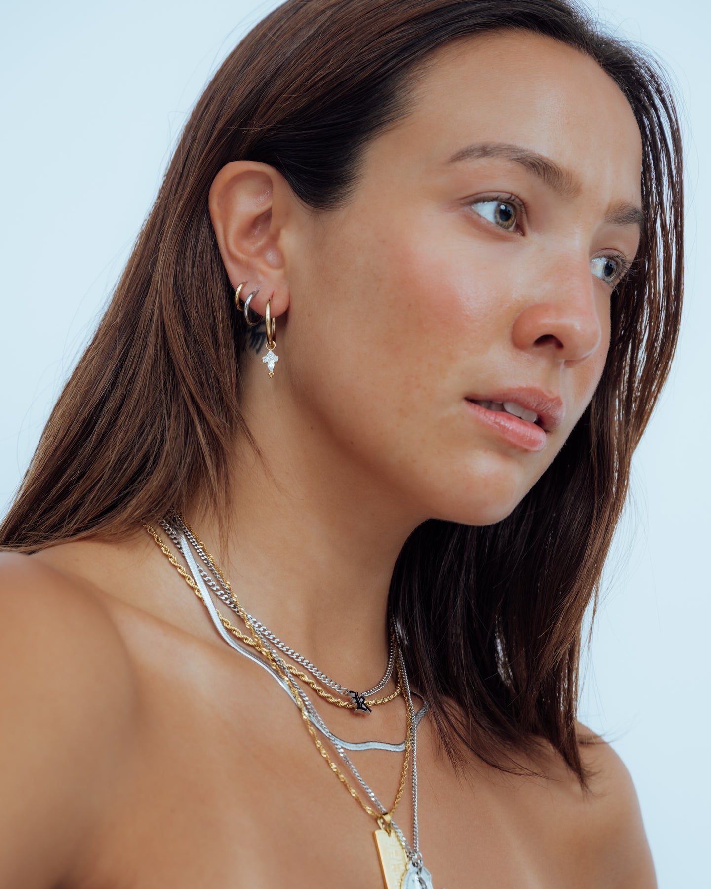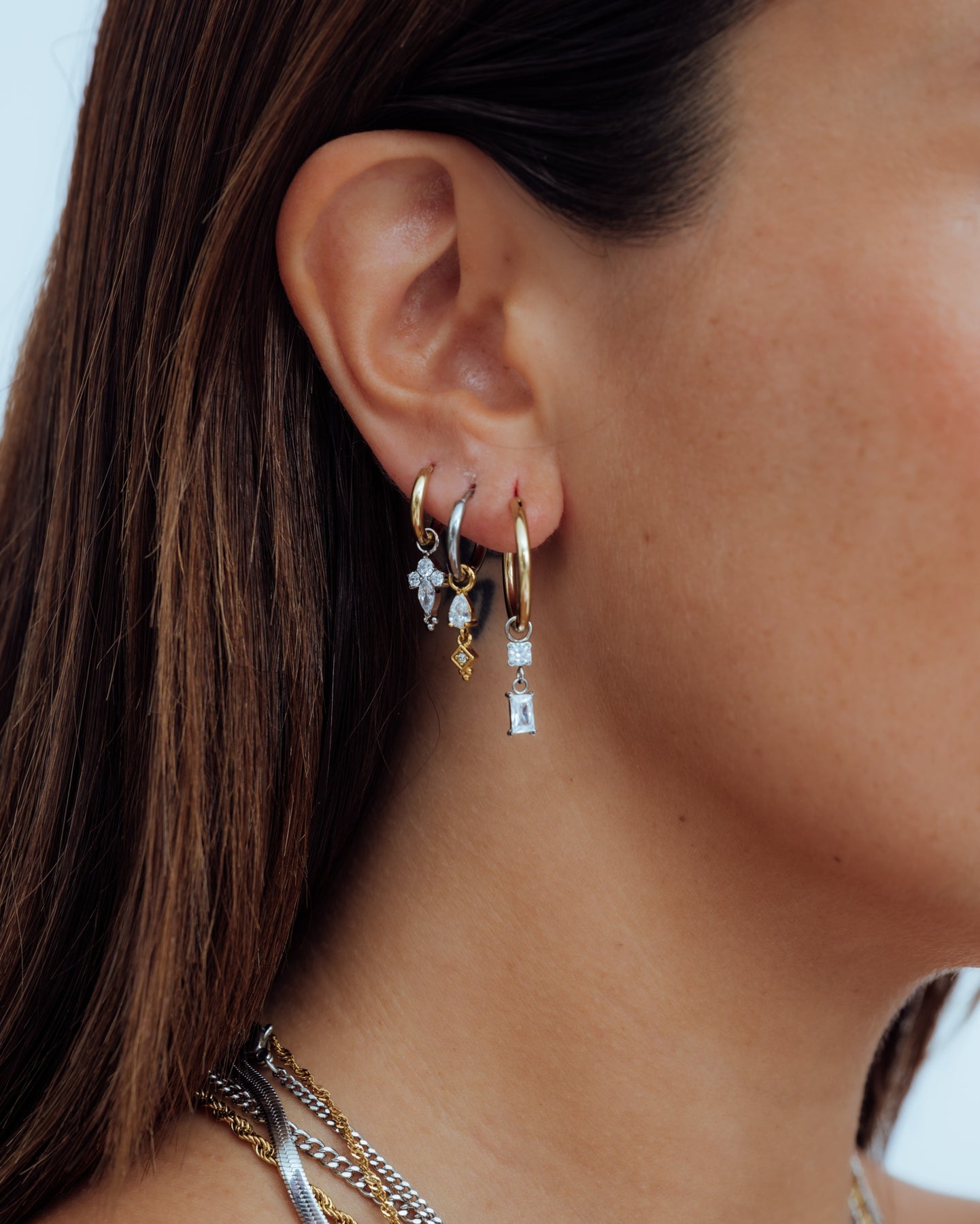 This White Snow Cross Charm features a marquise cut center stone framed by round, prong set crystals for a vintage-inspired look.Customizable and interchangeable, it pairs perfectly with our My Huggies Hoop Earrings and My Huggies Sparkle Hoop Earrings, allowing you to create a look that's uniquely yours.