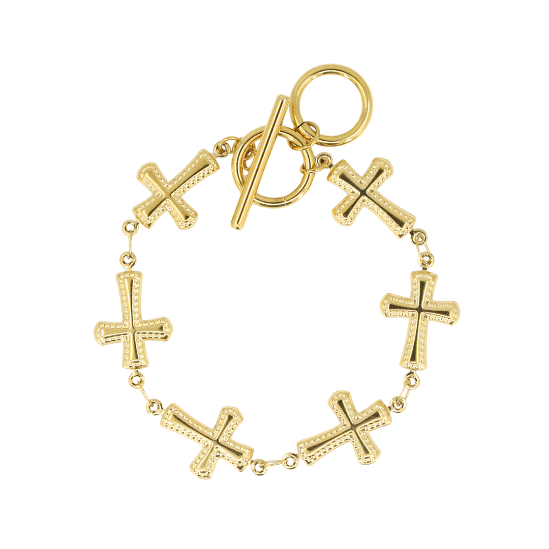 A bold yet refined staple, this puffy cross bracelet features a softly rounded silhouette and a sculptural feel that catches the light with every move. The toggle clasp offers easy adjustability, making it perfect for layering or wearing solo as a statement piece.Materials: