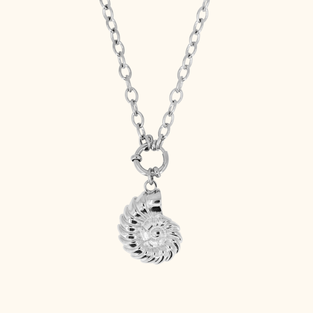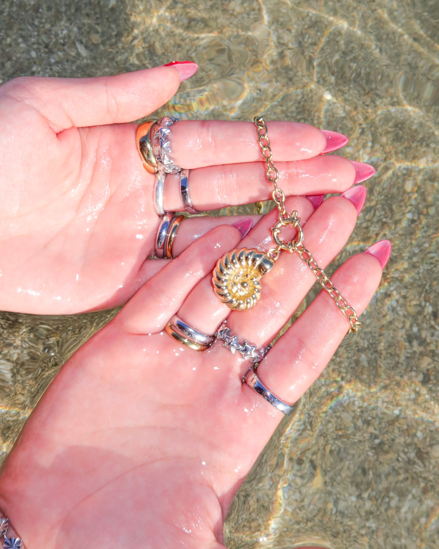 Inspired by the spiraled beauty of the sundial shell, this necklace captures the rhythm of the ocean and the ease of long summer days. With soft curves and sun-warmed shine, it’s a quiet reminder to move with the tides—grounded, free, and always in flow.
