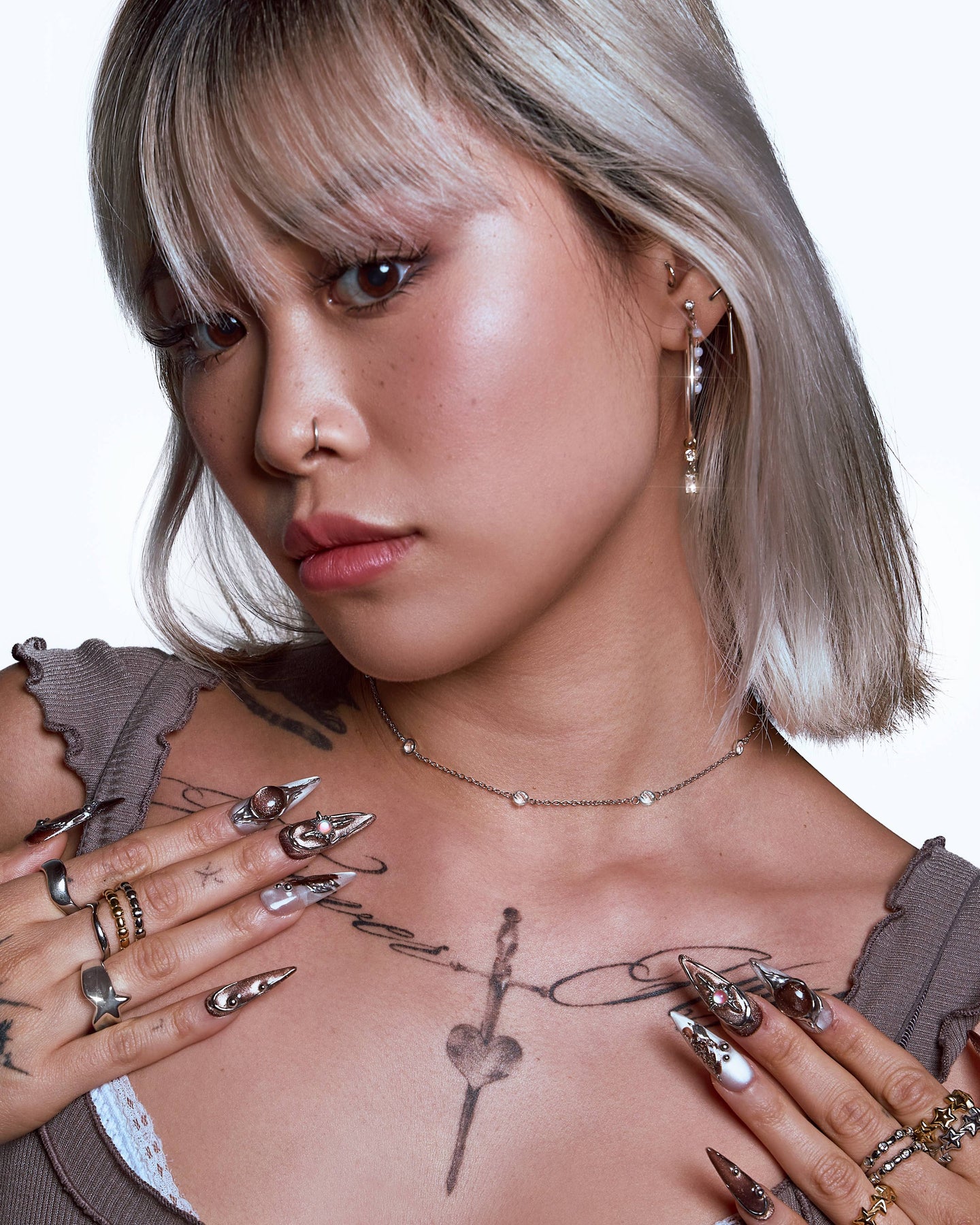 Delicate and radiant, this Diamond Bezel Satellite Choker features shimmering bezel set stones spaced along a fine chain, creating a light catching, floating effect. Designed in a choker length that sits perfectly along the collarbone, it adds a subtle sparkle whether worn alone or layered.