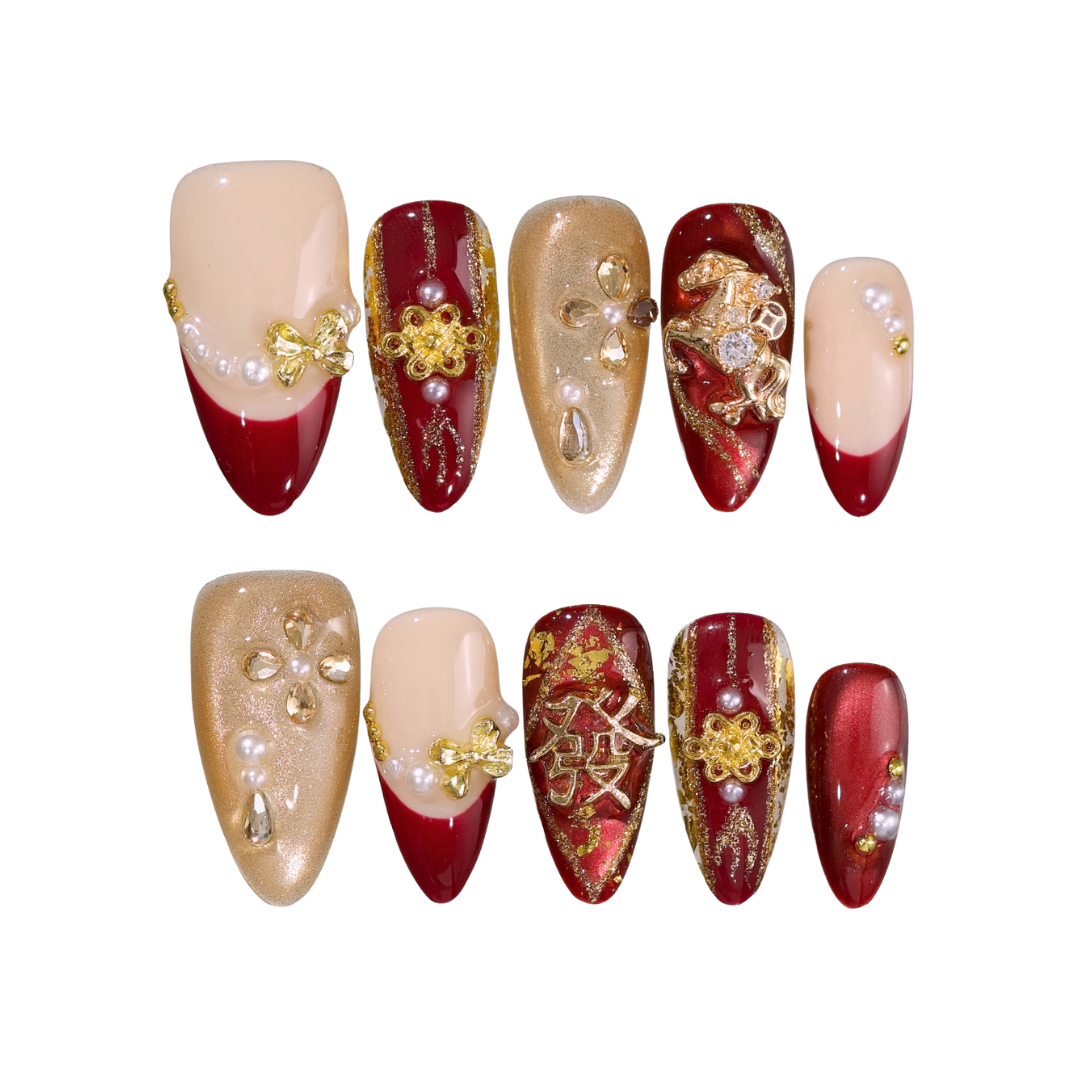 Description:Created in collaboration with Ersa Nails x Stay Golden, this nail set celebration of the 2026 Lunar New Year. The nail set features rich red and gold tones symbolizing prosperity and good fortune, adorned with the “發” character for wealth and a playful horse motif inspired by the phrase 馬上發財 which means instant wealth.Nail Details:Nail Shape: Medium AlmondApprox. Length: 18–25mmHandmade with care by Valentina the founder of Ersa Nails -