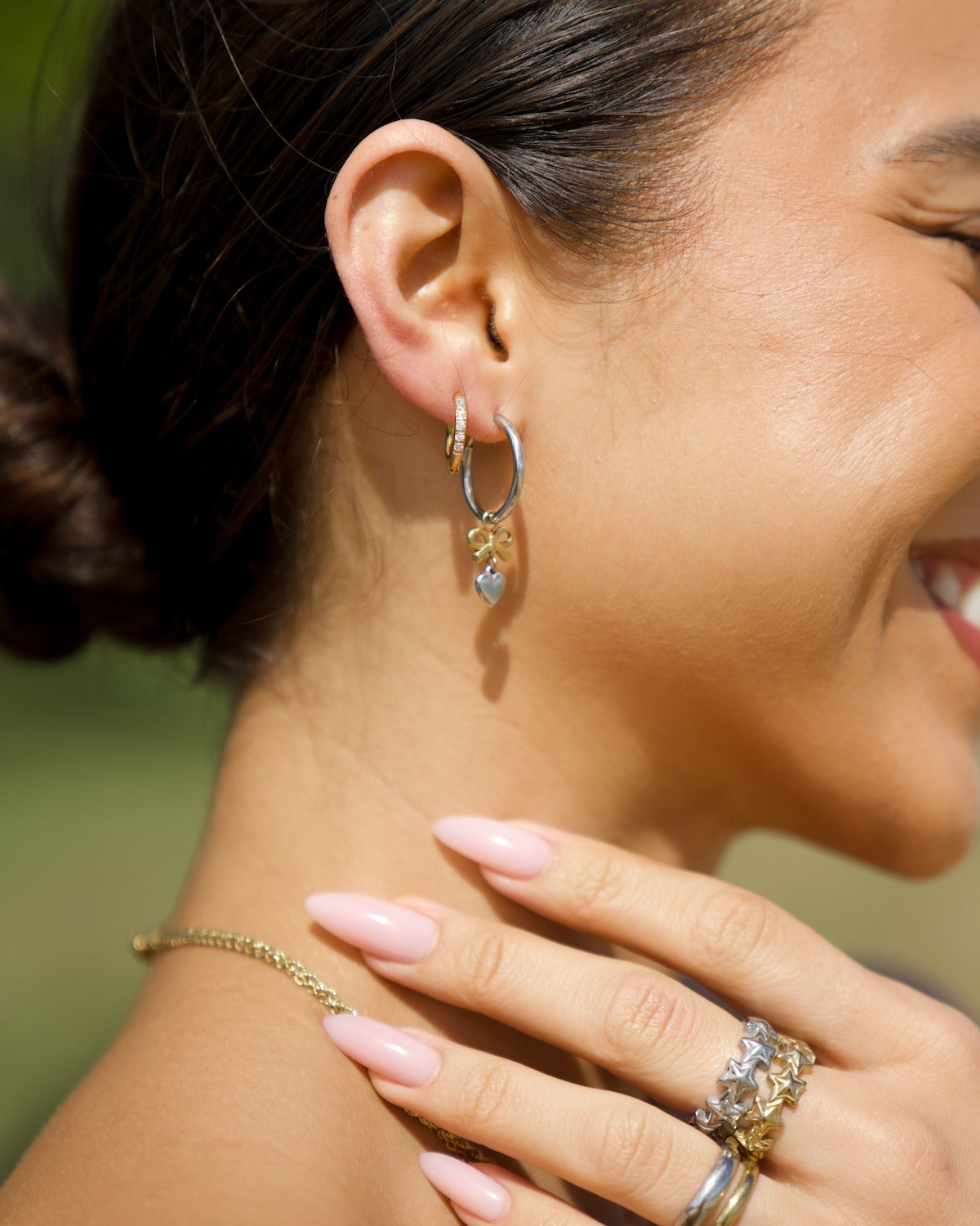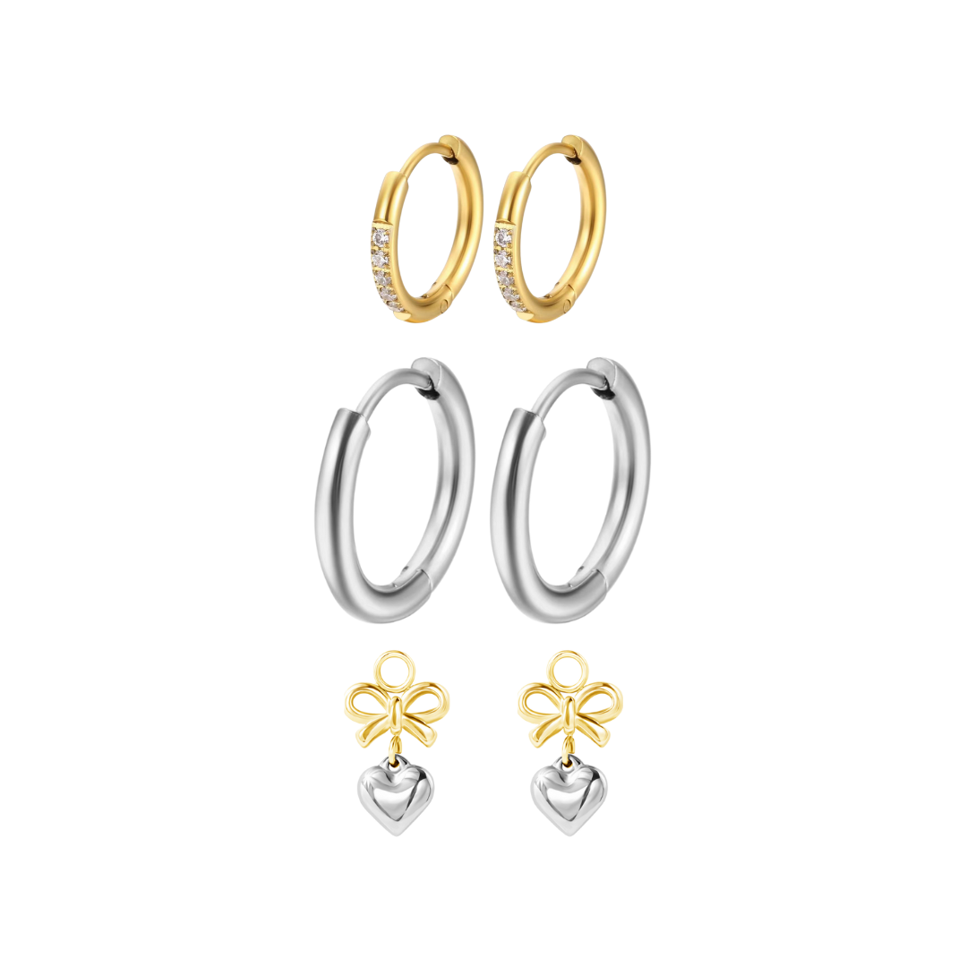 Designed for the metal mixers, this bundle blends warm gold and cool silver tones with a sparkling 10mm huggie, a classic 15mm hoop, and our two-toned ribbon heart charms. It’s a playful yet polished set that lets you embrace contrast and create a look that’s all your own.